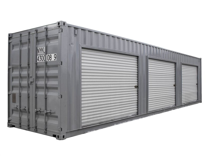 Cette unité est construite à partir d’un conteneur d’expédition 40 ‘étanche au vent et à l’eau. Le conteneur est construit en acier anti-corrosif CORTEN et les portes roulantes sont en acier ondulé de calibre 26 et recouvertes d’une peinture polyester durable. Des soudeurs certifiés découpe la paroi latérale du conteneur, construit un cadre en acier et soude le tout en place. Le cadre en acier maintient l’intégrité structurelle du conteneur et la peinture offre une finition durable une fois les portes roulantes installées. Pour une sécurité accrue, chaque porte roulante a un loquet magnétique en acier zingué qui peut être verrouillé.