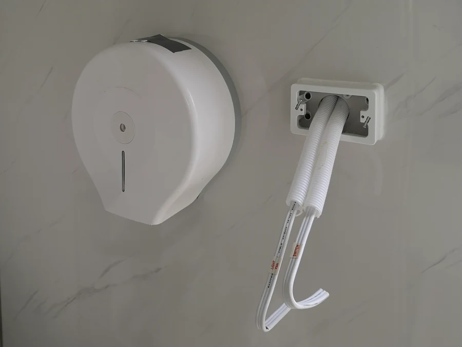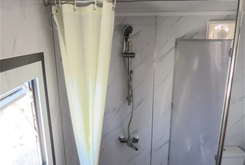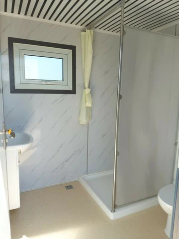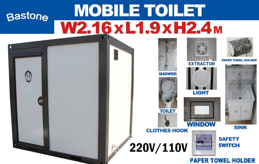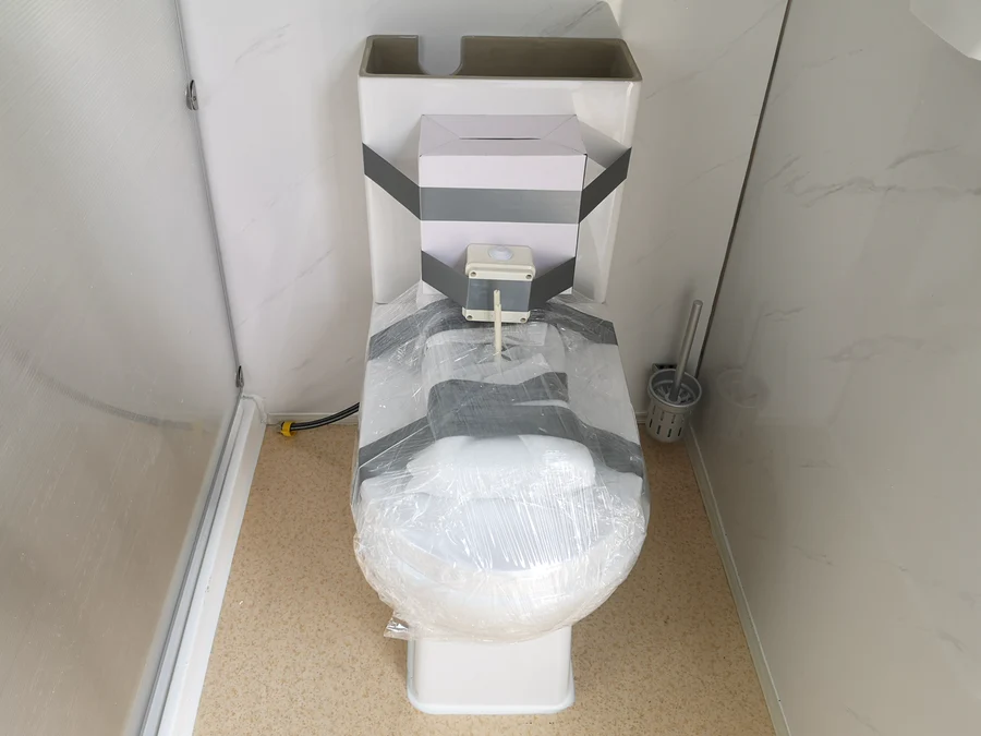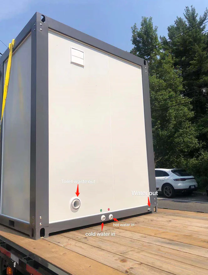 Ces toilettes portables avec douches sont utilisées sur un chantier de construction, nous vous recommandons de raccorder les toilettes au système d’égout sanitaire et de raccorder l’eau froide au système de tuyauterie, l’eau chaude au brûleur de chauffage. Sinon, vous aurez peut-être besoin de réservoirs à l’extérieur de la structure pour les déchets.